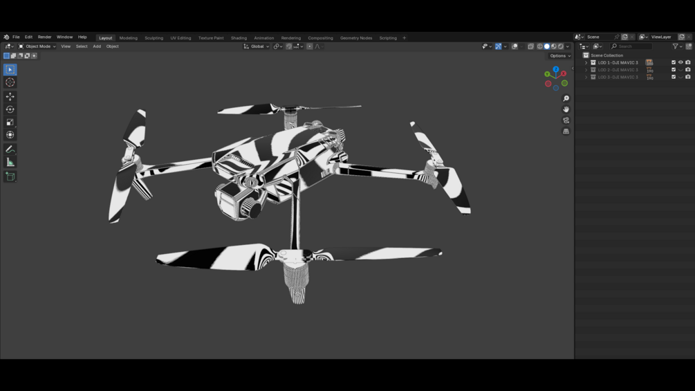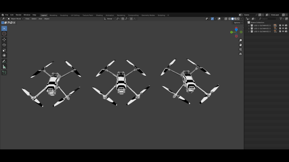 - 1 Blender file with the 3 LODs meshes -> Only the mesh of the drone is provided, there is no texture !