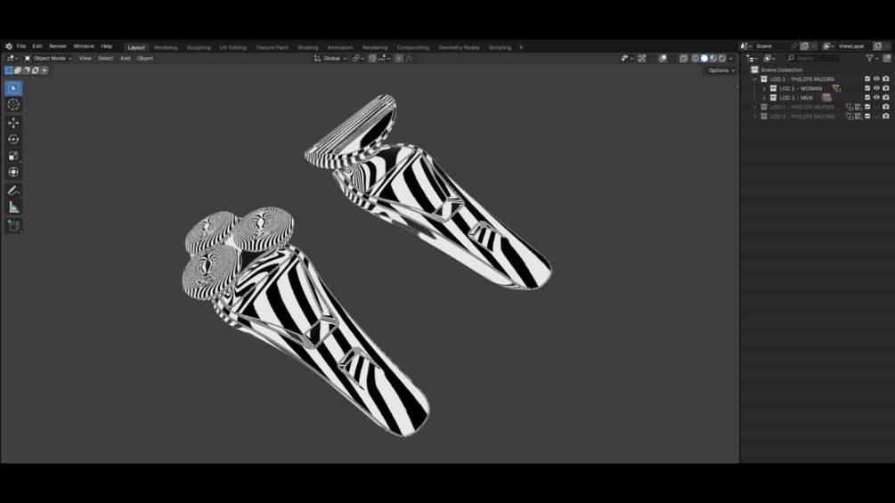Here is a modeling creation of two Philips Razors. I used a process similar to Philips to rebuild this watch. This model was created with Autodesk Alias and then converted into FBX (.fbx) for import into Blender (.blend).